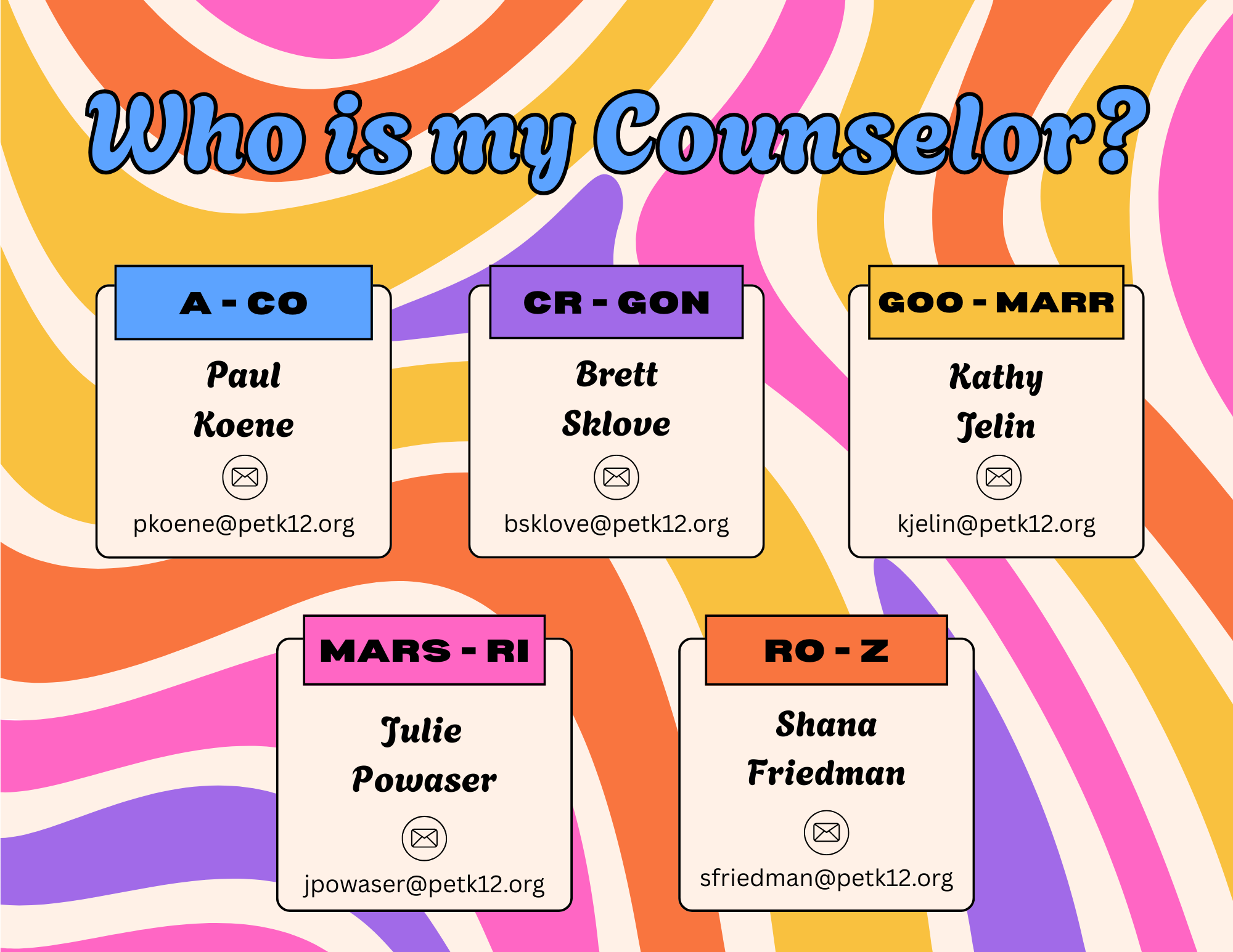 All counselors can be found in the Counseling Office during school hours. If you would like to schedule an appointment to talk with your counselor, you will find a QR code on the front desk of the Counseling Office. The QR code to request an appointment can also be found here >>>>